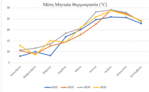 Διάγραμμα Α: Μεταβολή της μέσης μηνιαίας θερμοκρασίας για το 2025.