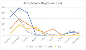 Διάγραμμα Β: Μεταβολή της μέσης μηνιαίας βροχόπτωσης για το 2025.