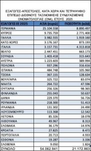Ακολουθεί η κατάταξη των χωρών της ΕΕ και Τρίτων Χωρών με βάση το κριτήριο της αξίας εξαγωγών ελληνικών οίνων για το 2025.
