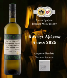 Το δημοφιλές και διαχρονικό Κατώγι Αβέρωφ Λευκό 2025 κέρδισε Χρυσό Βραβείο στον Διαγωνισμό Berliner Wein Trophy και Αργυρό Βραβείο στον Διαγωνισμό Texsom International Wine Awards.