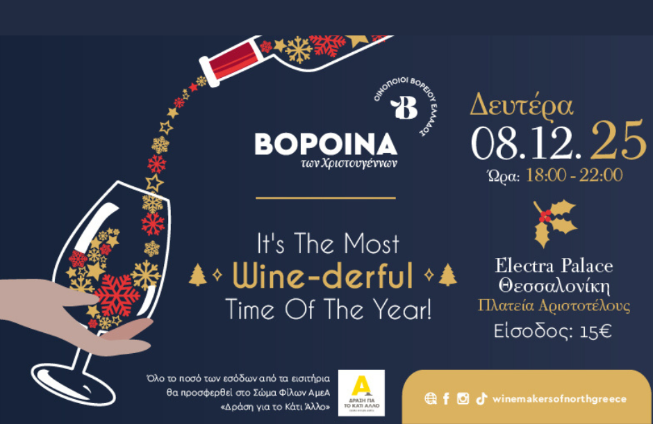 Τη Δευτέρα 8 Δεκεμβρίου οι «Οινοποιοί Βορείου Ελλάδος» ενώνουν τις δυνάμεις τους για την πιο λαμπερή οινική εκδήλωση της χρονιάς, συνδυάζοντας τον αυθεντικό χαρακτήρα του επώνυμου ελληνικού οίνου, στο βάθος του χρόνου και στην εξέλιξή του, με το πνεύμα και τη χαρά της προσφοράς.